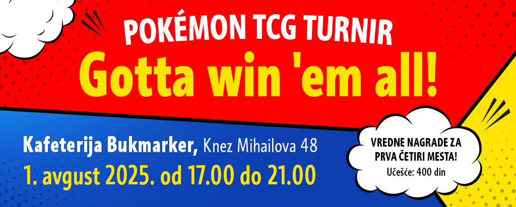 Ljubitelji Pokémon Trading Card Gamea,Imaćete priliku da odmerite snage na turniru „Gotta win 'em all!“, koji će se održati u petak 1. avgusta, u prijatnom ambijentu Kafeterije Bukmarker (Knez Mihailova 48), u terminu od 17 do 21 sat.Turnir okuplja igrače svih nivoa – od entuzijasta...