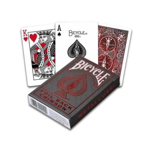 Bicycle MetalLuxe Crimson Rider Back karte za igranje u premium pakovanju sa reljefnim detaljima. Ovaj Crimson raskošno dizajniran špil poseduje MetalLuxe folije na poleđini svake karte. Napravljene su od premium kvalitetnog kartona sa Air-Cushion završnom obradom za glatkoću i dugotrajnost.