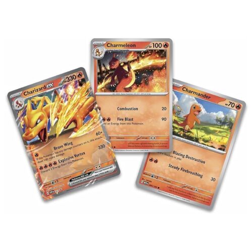 Pokemon TCG: Čarizard eks Super-Premium kolekcija uključuje 1 foil promotivnu karticu sa Čarizardom Ex, 2 foil kartice sa Čarmanderom i Čarmeleonom, 1 figuru za prikazivanje kartica sa Čarizardom i karticu sa kodom za Pokemon TCG Live. Takođe, u pakovanju se nalazi 10 buster paketa iz različitih Pokemon TCG ekspanzija. (Svaki buster paket sadrži 10 karata i 1 osnovnu energiju. Karte se razlikuju u zavisnosti od paketa.)