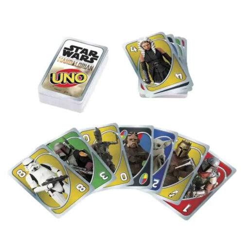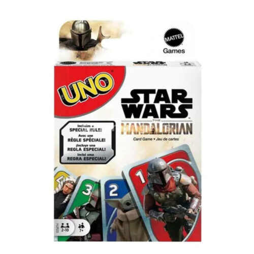 Mattel UNO – Star Wars je klasična kartaška igra koju svi znaju i vole, ali koja sadrži grafiku iz Star Wars-a uključujući Mando, Kuiil i Grogu.